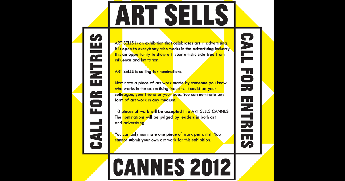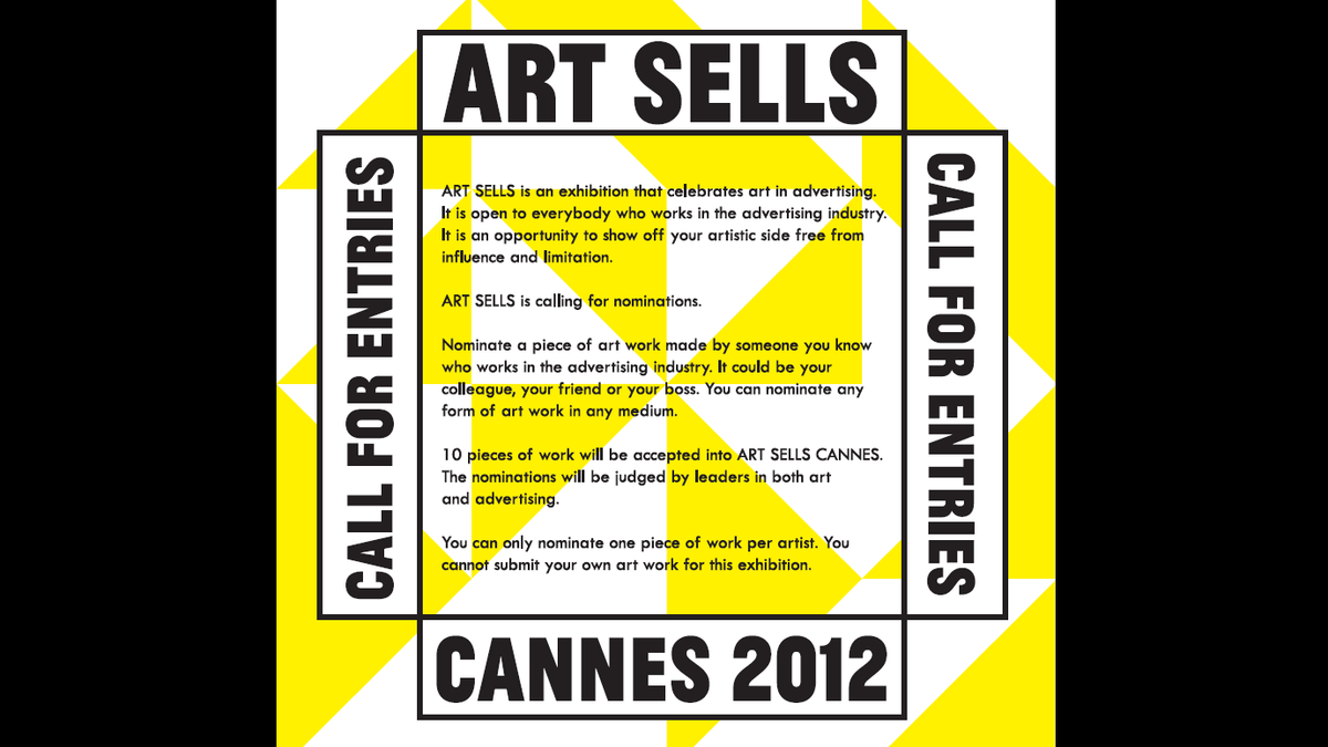 Ten pieces of work (as opposed to 60 at the last ART SELLS at Village Underground, London) will be accepted into the Cannes edition and nominations will be judged by leaders in both art and advertising. You cannot submit your own artwork for this exhibition and the names of guest judges will be announced soon.