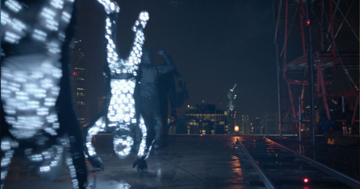 Each one of the figures in the piece, directed by Adam Berg, wore a suit containing 1,680 LED lights that were wirelessly activated to create the illusion of acrobatic motion at impressive speed.