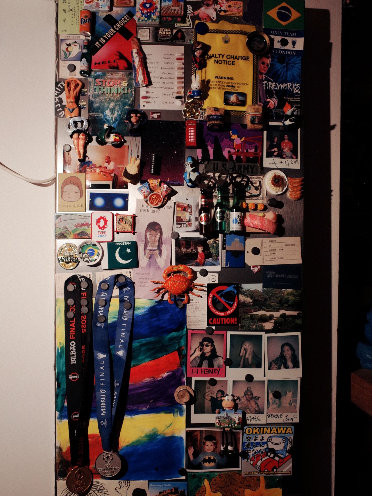 I have covered it with some of my favourite photos, drawings, magnets from my travels and all sorts of miscellaneous bits like pamphlets that arrive through the letterbox.