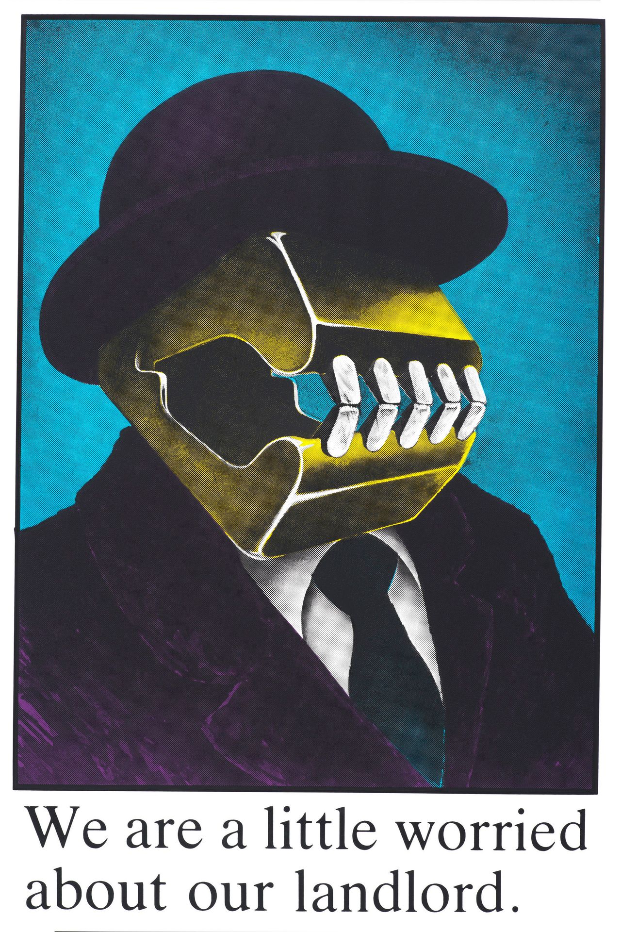 One of the most iconic, and influential, is We Are A Little Worried About Our Landlord. Designed by Phillips in 1986, it shows a besuited man with a mechanical digger in place of a face, baring alarming teeth beneath a bowler hat.