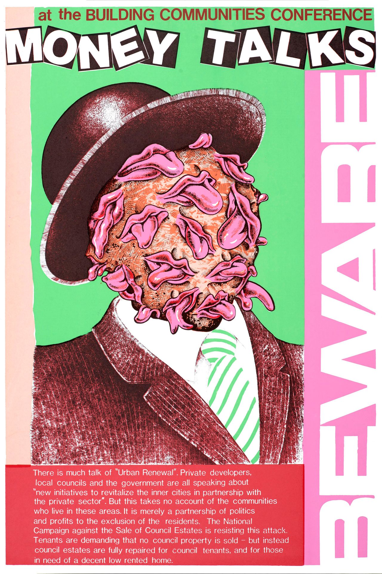 ABOVE: This poster for The National Campaign Against the Sale of Housing Estates was a sinister visualisation of those behind cynical profit-driven 'urban renewal' initiatives.